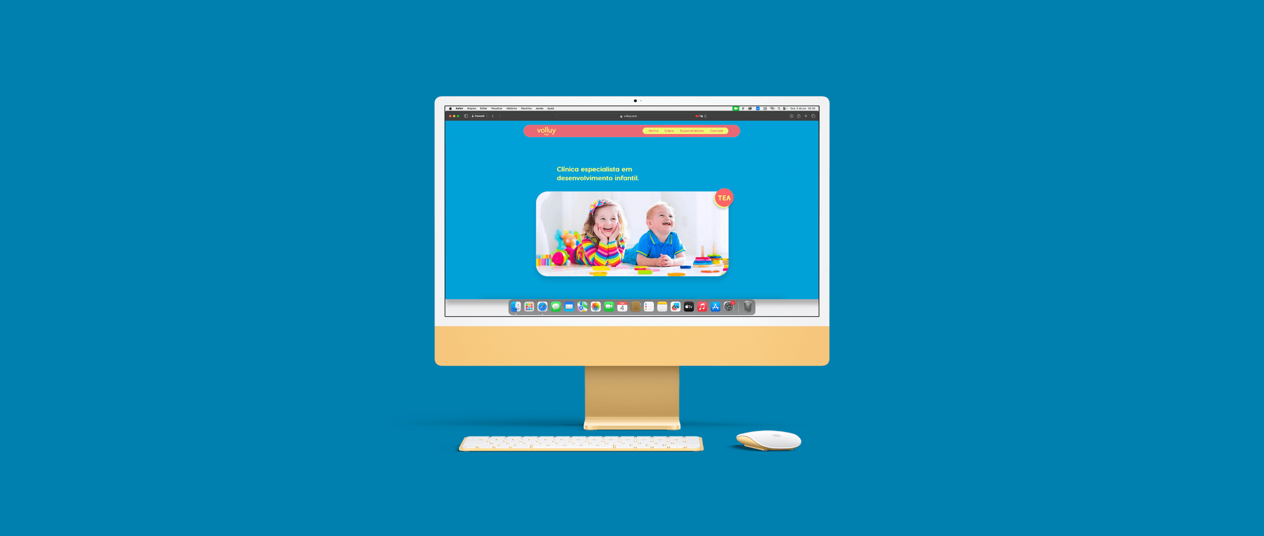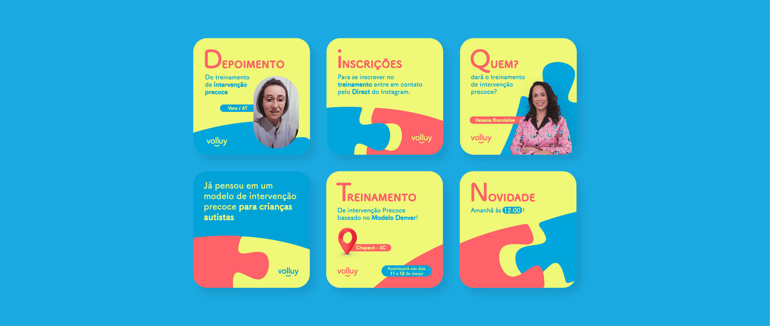 Desenvolvemos a identidade visual completa para a Clínica Volluy, especializada em desenvolvimento infantil e autismo, nossa parceira há 5 anos. Criamos peças de comunicação inovadoras, elementos 3D e um website moderno. A marca incorpora peças de quebra-cabeça simbolizando o autismo, com azul (serenidade, confiança, harmonia) e amarelo (otimismo, criatividade, alegria) destacados.